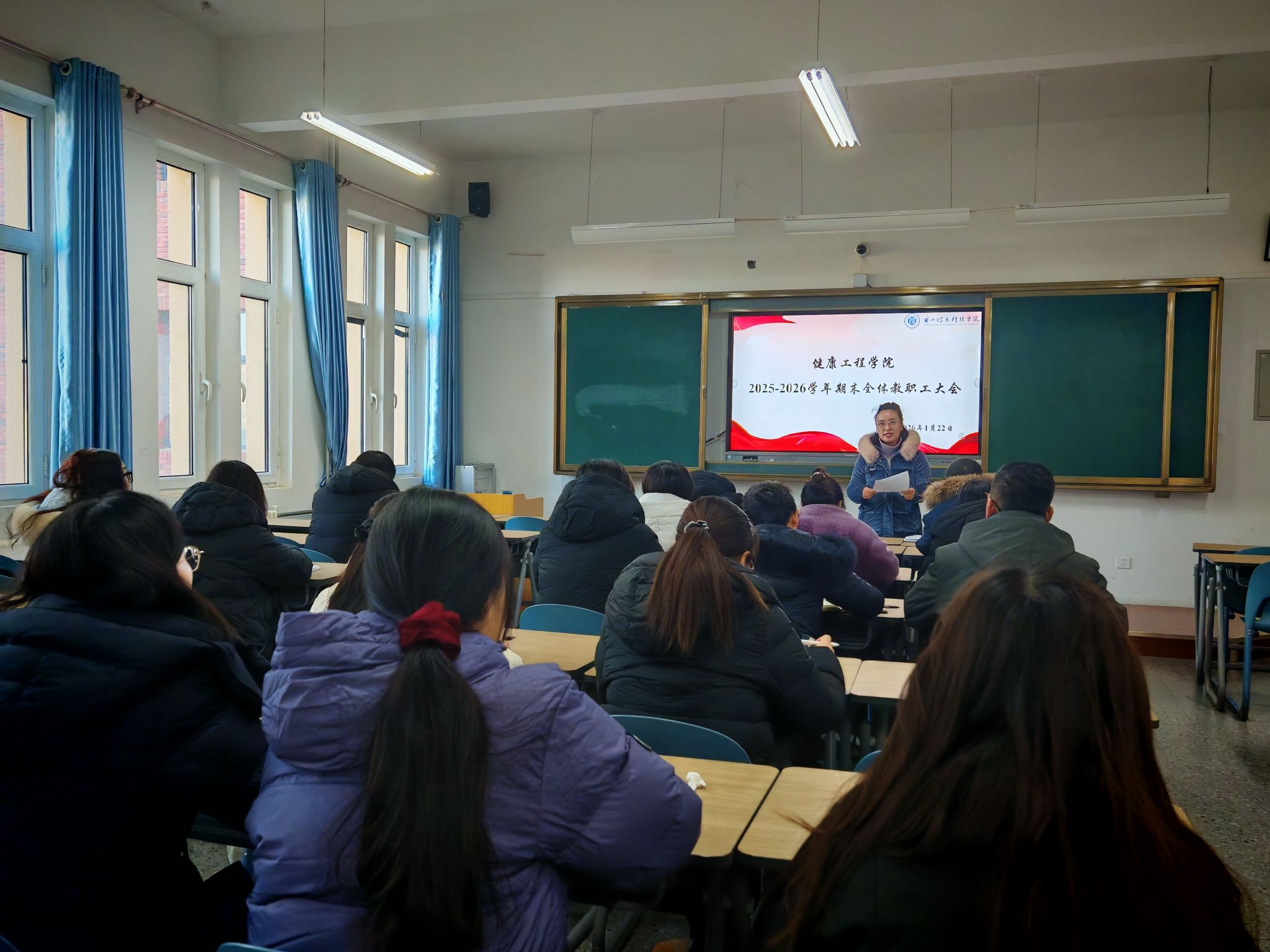 1月22日上午,健康工程学院在2号教学楼305教室隆重召开2025-2026学年期末全体教职工大会。会议由学院院长效碧亮主持,全体教职工齐聚一堂,共同回顾过去一学期的奋斗历程,展望未来发展蓝图。