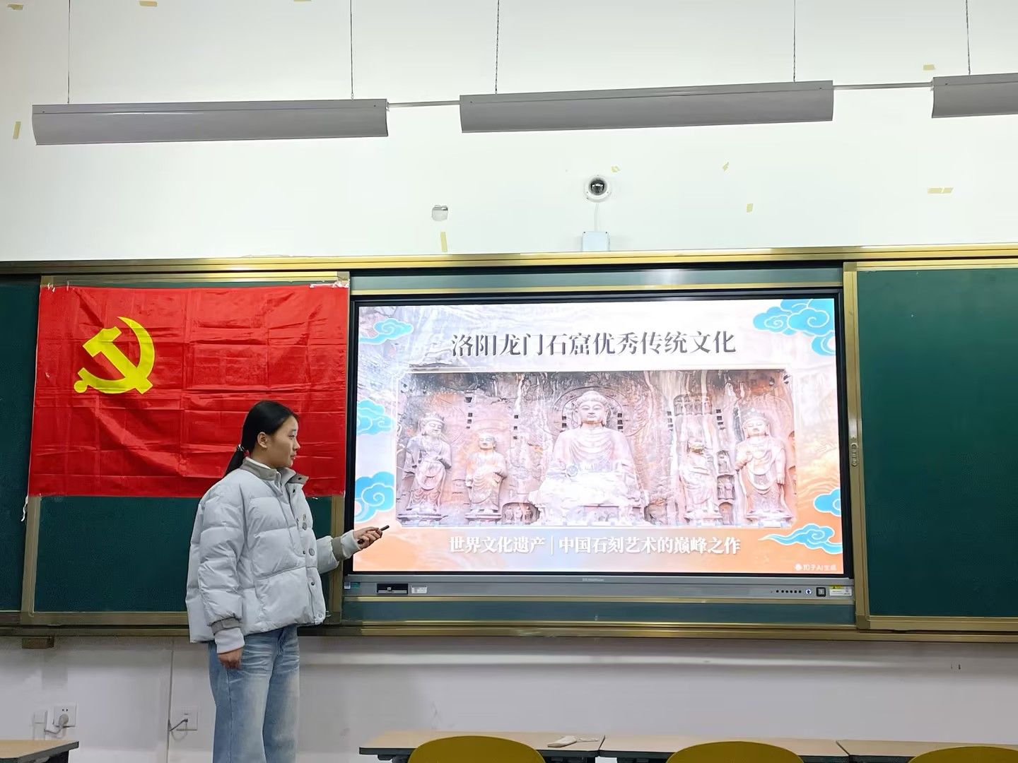 活动现场,学生党员尹雯以家乡洛阳龙门石窟为切入点,通过PPT展示与视频播放相结合的方式,带领全体成员沉浸式领略传统文化的魅力。从北魏孝文帝时期的开凿渊源,到历经千年风霜的石窟造像艺术;从飞天乐伎的灵动身姿,到卢舍那大佛的庄严慈祥,视频中流转的光影与PPT里详实的史料相互印证,生动呈现了龙门石窟作为世界文化遗产的历史价值与艺术成就,更传递出古人精益求精的工匠精神与兼容并蓄的文化胸怀。